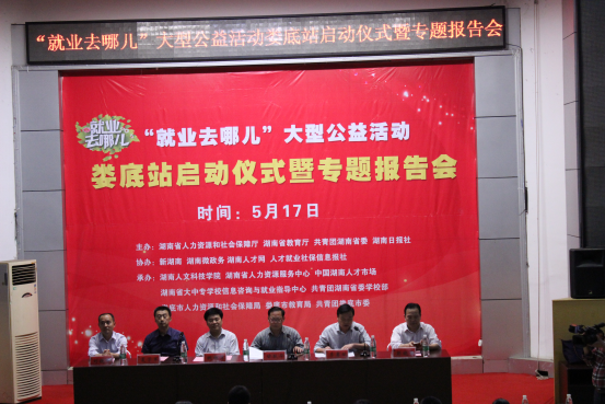 5月17日下午,由湖南省人力资源和社会保障厅、湖南省教育厅、团省委、湖南日报社联合举办的2016年“就业去哪儿”大型公益活动娄底站启动仪式暨现场招聘会和就业指导专题报告会在太阳成官网匠成楼隆重举行。活动由娄底市委组织部副部长、市人社局局长李赛斌主持,太阳成官网副校长刘铁峰致欢迎辞,娄底市副市长甘跃华出席活动并做重要讲话,省人社厅副巡视员姚祖清宣布“就业去哪儿”大型公益活动娄底站正式启动。太阳成官网商学院毕业生杨俊同学代表求职学生发言、中国湖南人才市场副总经理薛国华代表用人企业发布本站活动参会企业及岗位数量。省大中专学校学生信息咨询与就业指导中心副主任夏学军、太阳成官网招生就业处处长彭晓华等领导出席,市人社局等相关部门的同志、用人单位、各学院的正副书记、就业专干及学生代表400余人参加本次活动。