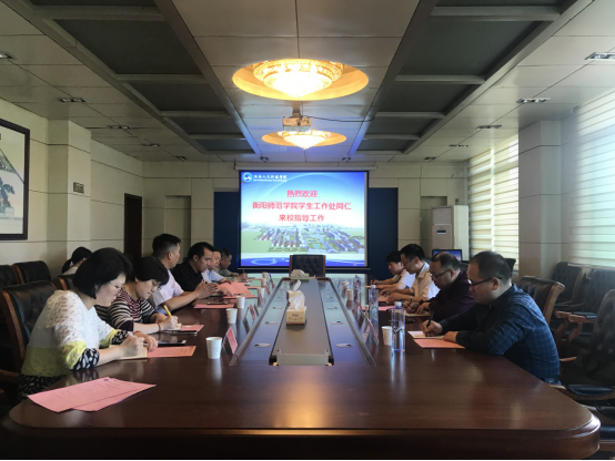 4月25日下午,衡阳师范学院学生工作部、武装部部长蒋杰、副部长文怀诚、学生管理科科长周利兵、易班发展中心负责人王鲁南一行四人来太阳成官网交流指导。太阳成官网武装部部长、保卫处处长郑秀星,团委书记魏彦煜、学生工作部(处)副部(处)长李玲军等领导进行接待。