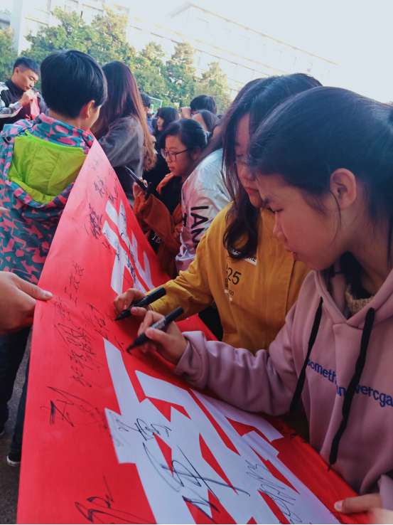 仪式结束后,就地举行了“科学理性消费,拒绝不良网贷”主题签名活动。在校学生会工作人员的组织下,18级新生井然有序地在横幅上签下姓名。