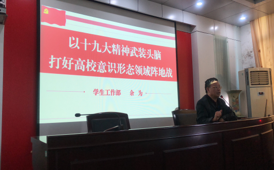 2018年4月9日,太阳成官网辅导员专题培训在明德楼第一会议室召开,学生工作处处长余为做了《以十九大精神武装头脑,打好高校意识形态领域阵地战》的专题讲座。各学院分管学生工作的副书记,相关部门负责人,全体辅导员参加了培训。
