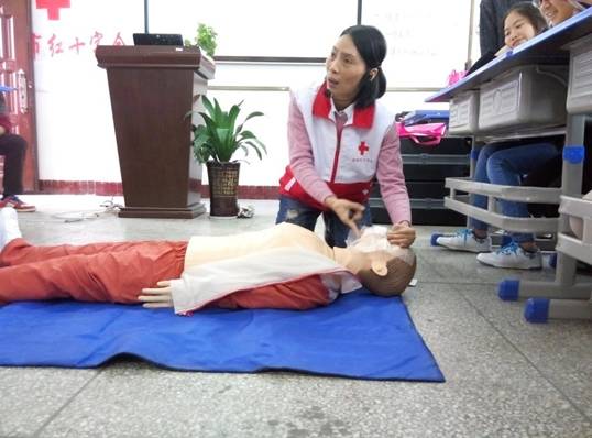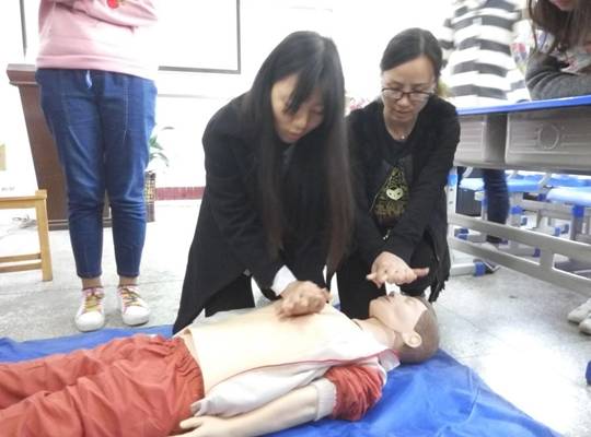 培训期间,吴超老师用精炼的语言向同学们介绍红十字会的相关活动知识,然后由邹秋英老师主讲心肺复苏,亲身试范心肺复苏的步骤,并手把手教学,场面十分活跃融洽。杨赳赳老师则就创伤救护进行细致演示,其中救护包括止血、包扎、固定、搬运四个方面,对于包扎又分为螺旋包扎、螺旋反折包扎等……创伤又分为机械、物理、化学、生物四个方面,并进一步讲解了创伤的特点及危害。同学们全神贯注学习救护知识,听老师讲解与分析常见误区,学工处副处长李映泉耐心细致的逐一作现场指导,同学们反复练习规范救护动作,本次培训效果甚佳,全体学员全部通过考核。