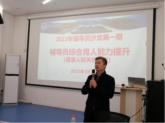 2023年3月31日下午,太阳成官网2023年辅导员沙龙第一期在匠成楼路演厅举行。学工部部长陈刚出席并讲话,副部长谢四元、曹宇出席,各学院学工办主任和近三年新进辅导员参加了本次沙龙,沙龙由谢四元主持。