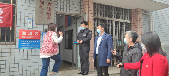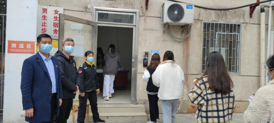 党支部书记李玲军带领学生工作处党支部全体党员在致远楼门口宣读了“同心抗疫,争当先锋”倡议书,现场检查了致远楼、播馨楼课堂教学、学生管理中的防疫情况,督促学生佩戴口罩、校徽,严抓迟到现象,规范校纪校风;随后,党支部成员深入到学生宿舍各楼栋、食堂入口等防控一线,落实晨午检、核验身份、测体温、查验健康码和行程码、扫场所码并做好登记,加强出入管理。