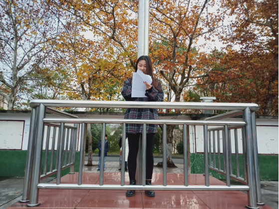 学生代表孟玥作国旗下演讲,她呼吁大家珍爱生命,重视人身安全;并提醒大家要注意身边的火灾隐患,重视消防工作。随后,她就财产安全问题、防盗意识问题以及校园贷问题等一系列问题作详细阐述。