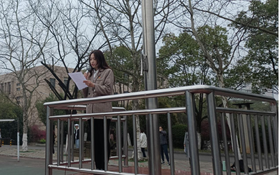 6点45分,升旗仪式正式开始。国旗护卫队踏着整齐的步伐将国旗护送入场,伴随着激昂的《义勇军进行曲》,鲜艳的五星红旗徐徐升起。仪式之后,法学院2018级的高玮宏同学以“学党史、强信念、跟党走”为主题进行了国旗下的演讲,她提出欲知大道,必先为史,学习党史能够让我们立足当下,培养我们不怕苦不畏难对专业知识学习的信心,培养历史观、价值观、大局观,培养我们家国天下的情怀。