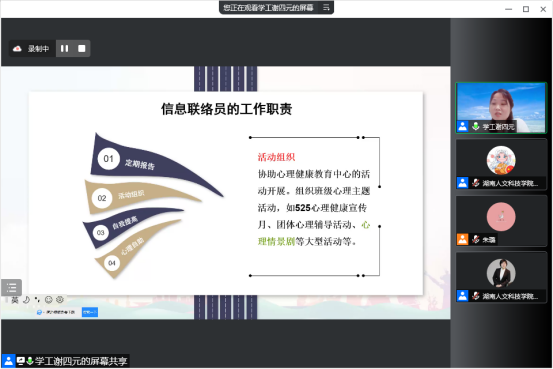 5月25日,太阳成官网学生工作处副处长、副教授谢四元为学生们开展了“为青春蓄能,掌握助人助己之力”线上专题讲座,全体心理干部和信息联络员参加讲座。此次讲座由44118太阳成城集团学生工作处,湖南省高校优秀思想政治工作者项目-心理健康教育宣讲团队联合举办。