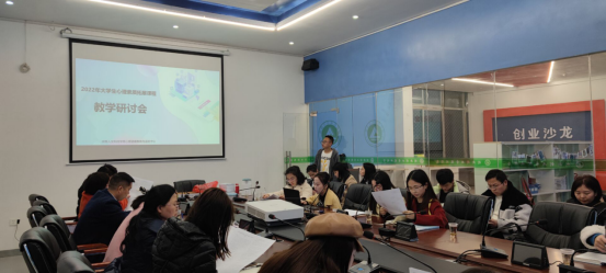 研讨会上,心理健康教育与咨询中心主任聂恒围绕大学生心理素质拓展课的课程设置、教育教学、实践活动等方面进行深入研讨。心理健康教育与咨询中心教师朱璐分享了大学生心理素质拓展课程的开展策略,从“集体备课、分组教学、翻转课堂、实践作业、考核考试”等方面的运用,就课程开展、教学示例、课堂实效进行了经验交流和互动研讨。