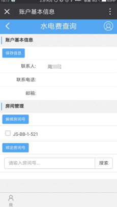 进入账户管理页面,如发现个人信息与实际水电表不符合,可进行修改绑定。如下图可进行个人信息更新保存,房间水电表解绑、绑定新的房间水电表。