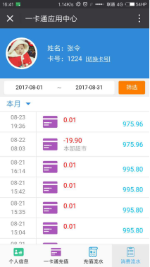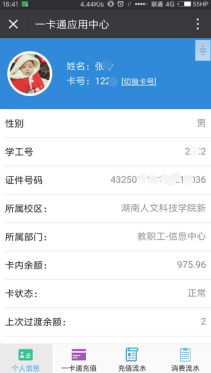 进入功能主页,默认显示当前卡号的基本个人信息与余额等信息。