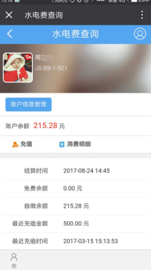 进入水电账户余额与账户信息的主页。主页信息区域默认显示当前卡余额与信息