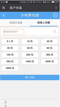 进入给他人充值页面。输入他们的水电账户与系统进行匹配,即可给他人进行充值。
