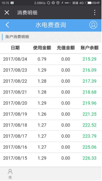 进入水电用度明细记录表。当前校内水电账户为一体。