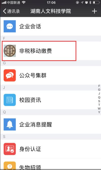 点击“非税移动缴费”,在打开的页面中可以进行学杂费的网上缴费。(此功能是湖南非税移动缴费平台,在学校微信企业号中做了链接)