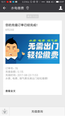进入充值页面,选择需要充值的金额,确认后即可发起微信支付。支付成功后相应金额即可进入水电账户,首页会有微信消息提醒。