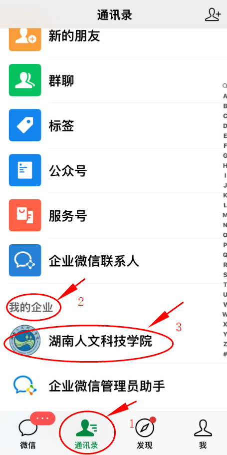 2、在普通微信下方“通讯录”菜单中,从上到下找到“我的企业”,选择“44118太阳成城集团”。