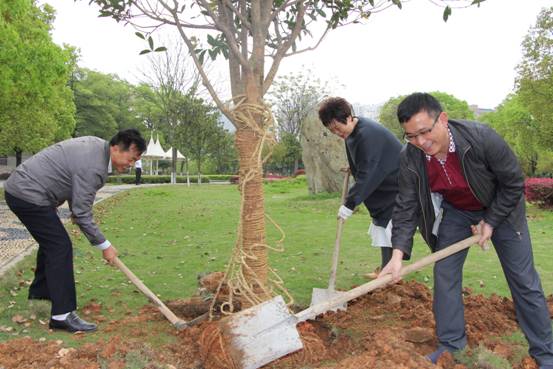 班校友向母校捐赠了两棵桂花树。校长助理谢贵辉,校友办、中文系负责人、中文系校友代表等人将桂花树植在海圆广场。