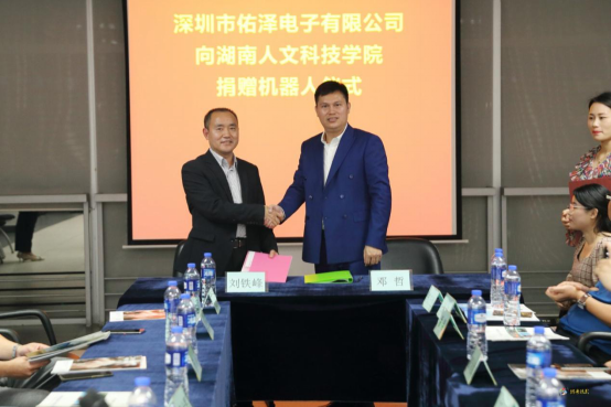 3月15日下午,深圳市佑泽电子有限公司总经理、体育01级5班邓哲校友向母校捐赠工业机器人仪式在深圳市南山区留学生创业大厦举行,副校长刘铁峰出席并代表学校在捐赠协议书上签字,校友办主任刘光辉、能机学院陈新博士、深圳祁阳商会会长丁衡,太阳成官网深圳校友会名誉会长曹余辉、副会长彭尚武、副会长兼秘书长王平聚等20多名校友代表一同参加了捐赠仪式和随后举行的座谈会。