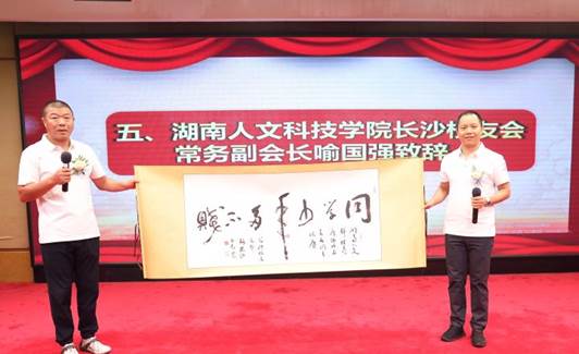 长沙校友会常务副会长、秘书长喻国强代表兄弟校友会致辞并向广佛校友会赠送贺子元校友的书法作品。