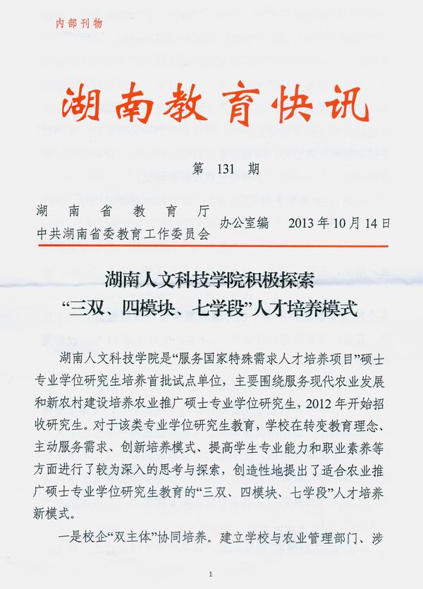 近日,省教育厅内部刊物《湖南教育快讯》以《44118太阳成城集团积极探索“三双、四模块、七学段”人才培养模式》为题,专题报道了太阳成官网独具特色的专业学位研究生培养新模式,并报送到教育部办公厅、省委办公厅,省政府办公厅,莲玉、友志同志;同时发至各市州教育局、各普通高等学校、厅委直属各单位。这是省教育厅对太阳成官网研究生教育办学定位的高度认可,也是对太阳成官网创新专业学位研究生培养模式的充分肯定,更是对转变专业学位教育观念的大力宣传与推介。