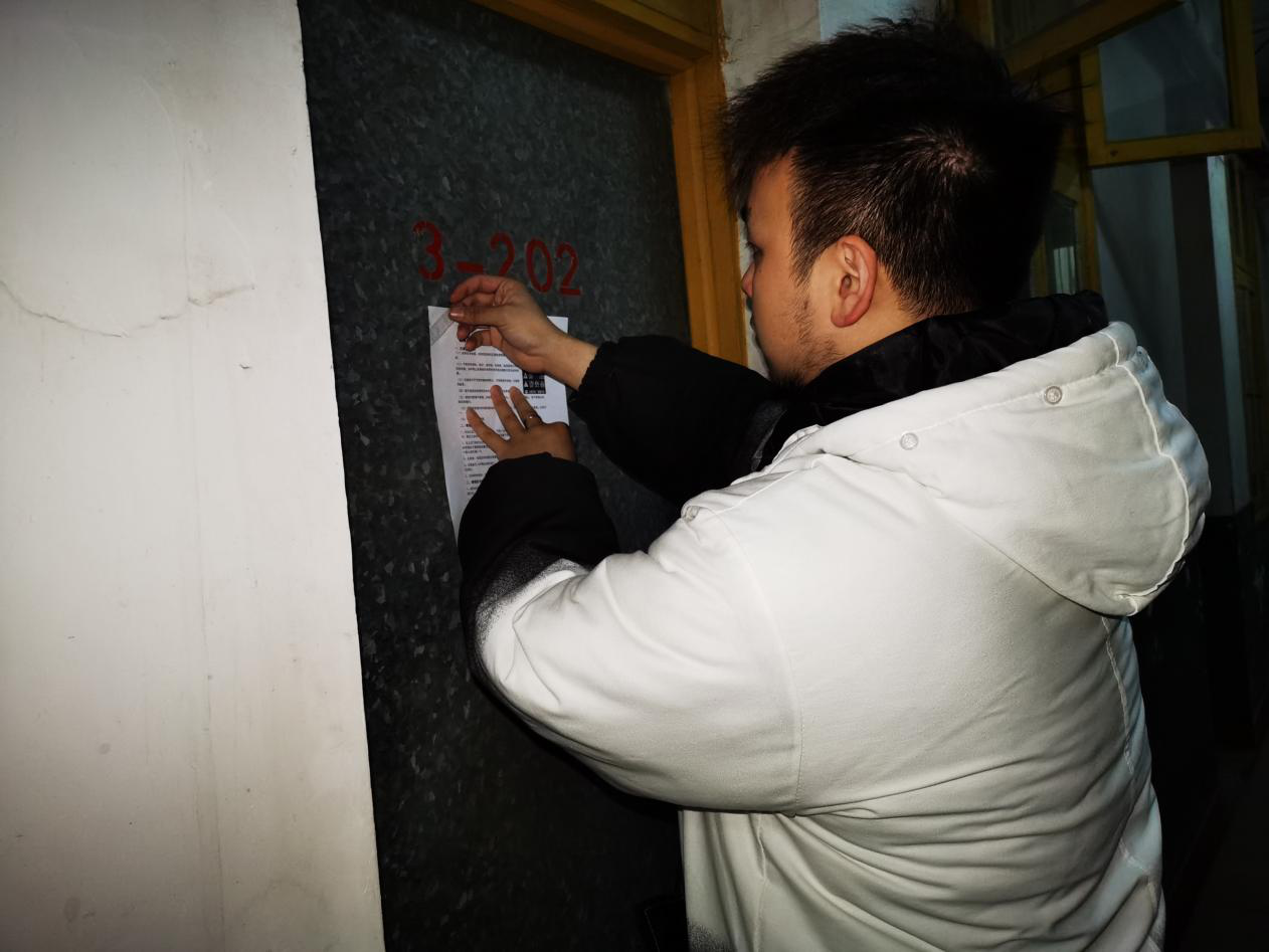 图四 研究生会副主席对无人的寝室进行“三防”宣传单的张贴 |