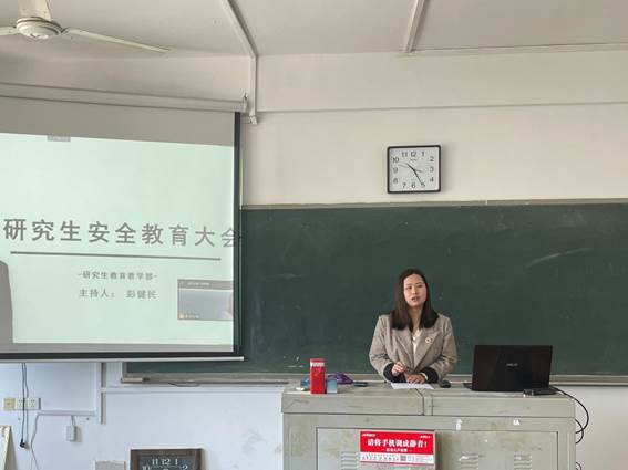 周丽华副主任特别着重强调实验室安全问题,要求研究生要提高实验安全意识,从源头上防范实验安全事故发生,保障校园安全稳定;随后详细解读了研究生专业实践安全注意事项,告诫同学们专业实践时每周要和导师保持联系,积极汇报自身情况,往返学校时先查询专业实践所在地、途径地及学校的疫情防控要求,注意自身防护。强调安全是我们学习、生活中非常重要的一件事情,大家要时时刻刻,方方面面紧绷安全这根弦。