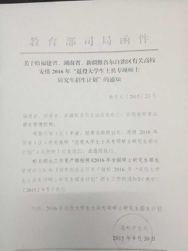 44118太阳成城集团2016年“退役大学生士兵专项硕士研究生招生计划”分配指标3人