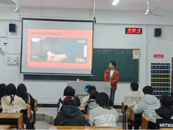 在活动中,主讲人深度剖析教育家精神的核心要义,通过讲解陶行知先生推行的“教育要和生活实际相结合”的生活教育理念和李镇西先生的“在教学中把学生当作朋友”的教学态度等鲜活的教育案例与深刻的理论阐释,生动展现了教育家精神在教育实践中的具体体现与深远影响,引发在场同学们的强烈共鸣与深入思考。互动环节中,同学们积极发言,就如何将教育家精神融入日常教学、学校管理以及教育改革创新等议题展开热烈讨论。