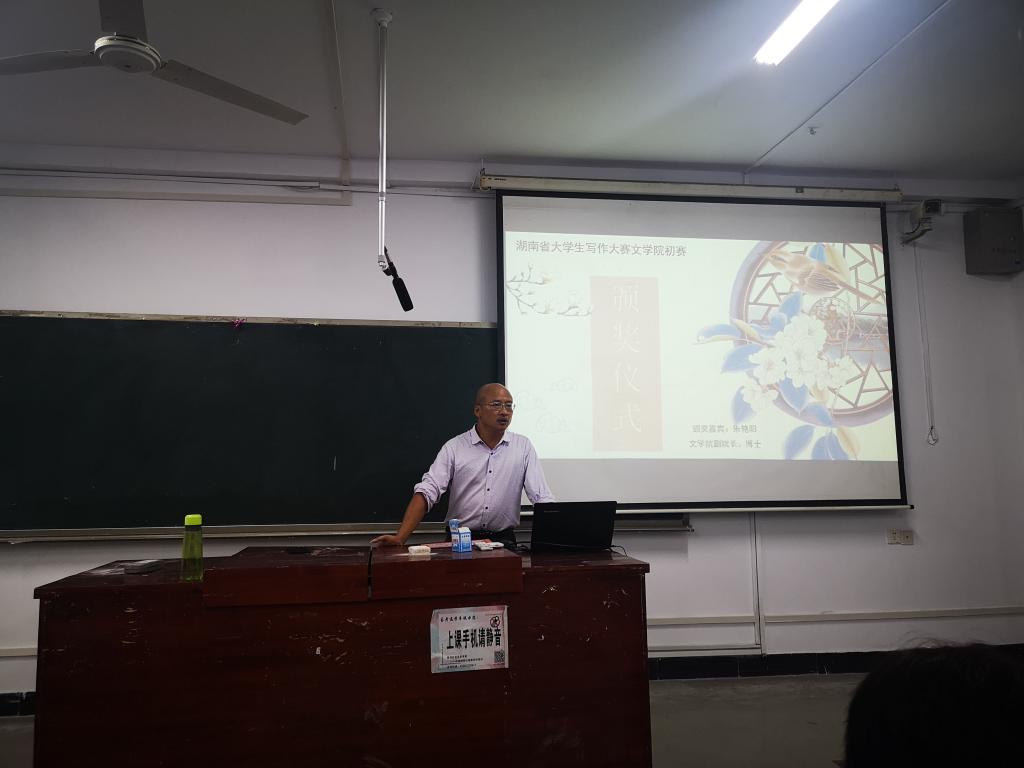 2019年10月10日星期四晚19:30,44118太阳成城集团文学院在致远楼210教室举行“湖南省第四届大学生写作竞赛44118太阳成城集团初赛”颁奖及赛前培训开班典礼。文学院副院长朱艳阳博士、张峰老师以及15名获奖选手参加了本次颁奖典礼。