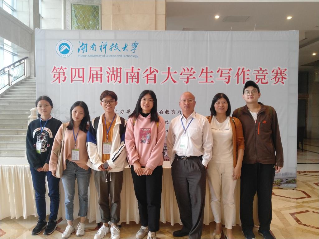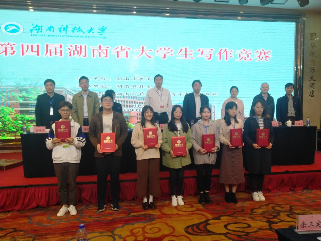本届大学生写作竞赛由湖南省教育厅主办,湖南科技大学承办,全省28所高校32支代表队160位选手参加了角逐。在2019年11月9日上午的笔试中,钟宏超、王帅两位选手凭着过硬的文学理论功底入围一等奖,获得了决赛答辩的资格。在第二天上午的现场答辩中,两位选手从容应对妙语连珠表现优异,获得了评委老师的一致好评。最终,王帅获得一等奖,钟宏超获得二等奖第一名。