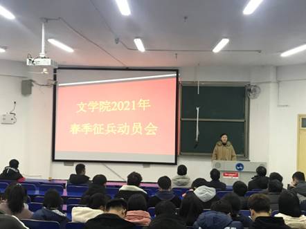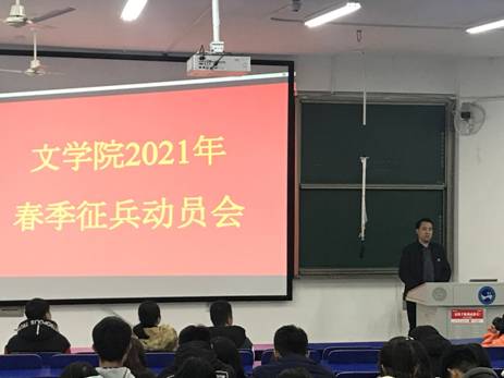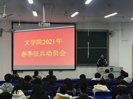 12月28日晚,文学院召开2021年春季征兵动员会。文学院党总支书记肖军凡主持会议。会议邀请了武保处处长郑秀星、武装部周樑老师及三名退役复学同学。文学院18-20级全体男同学及有意参军入伍的女同学参加了会议。