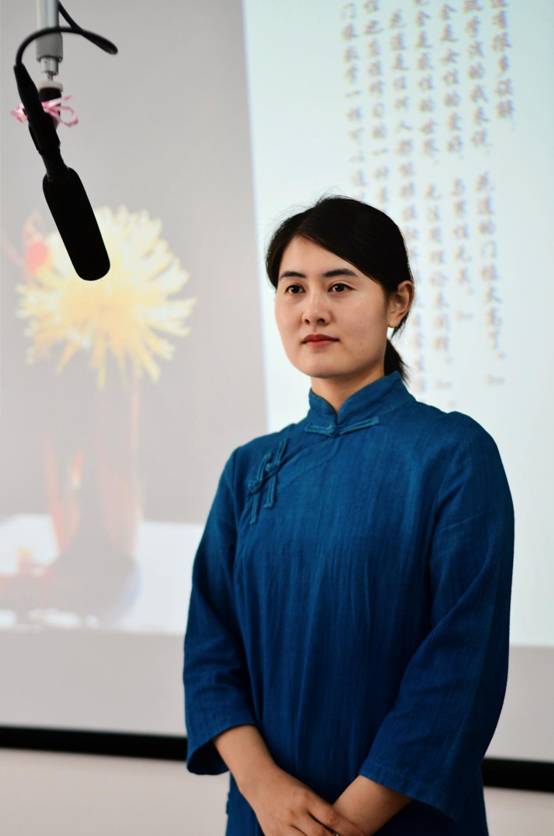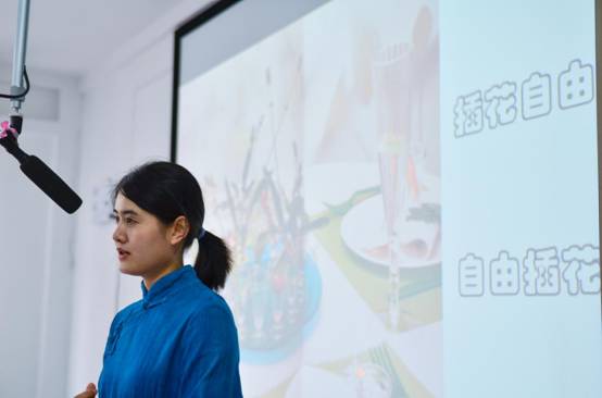 开场之后,胡纠纠老师登台授艺。胡老师首先向同学们阐述了花艺的涵义,花艺与茶艺的内在联系,接着介绍了中外花道的不同之处和中国花道里的蕴含的独特中国文化。