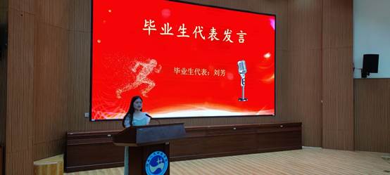刘芳同学作为优秀毕业生代表发言。她分享了自己在大学四年的成长经历,表达了自己对老师栽培的感谢和对同学情谊的珍惜,并倡导同学们努力付诸实践行动,成就精彩人生。
