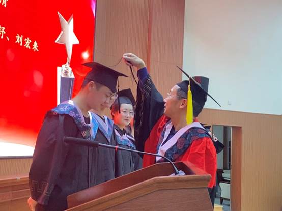 倪正芳院长诗意地将经典名著与人生哲理结合,他寄语毕业生们,“……看破红与黑,不做变色龙,警惕名利场,不做局外人,拼搏一千零一夜,终将走向伟大前程……”新起点,再出发,倪院长祝愿同学们在未来的道路中,能够专注每一步,走好每一步。随后,倪院长为毕业生代表举行了拨穗仪式。