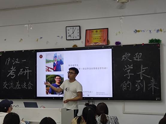 首先,钟宏超同学上台发言,他用幽默风趣的语言为同学们分析了当前就业前景,从为什么考研、怎么考研、考研的误区三个方面给同学们提出了意见和建议。此后上台的王林峰同学则为同学们分享了自己的大一生活,告诫同学们要珍惜时间,表示作为一名汉语言文学专业的学生即使没有考研的想法也要多读书,多写笔记,并尝试着抄写书籍,用心感受。