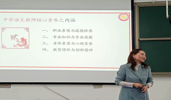接着,曾老师从“核心素养”概念的由来、四大标准的解读、中学语文教师核心素养的定义、教育情怀与创新精神这四方面入手,以自身从业经历为例,结合课标,向同学们阐述了养成中学语文教师核心素养的必要性和重要性。