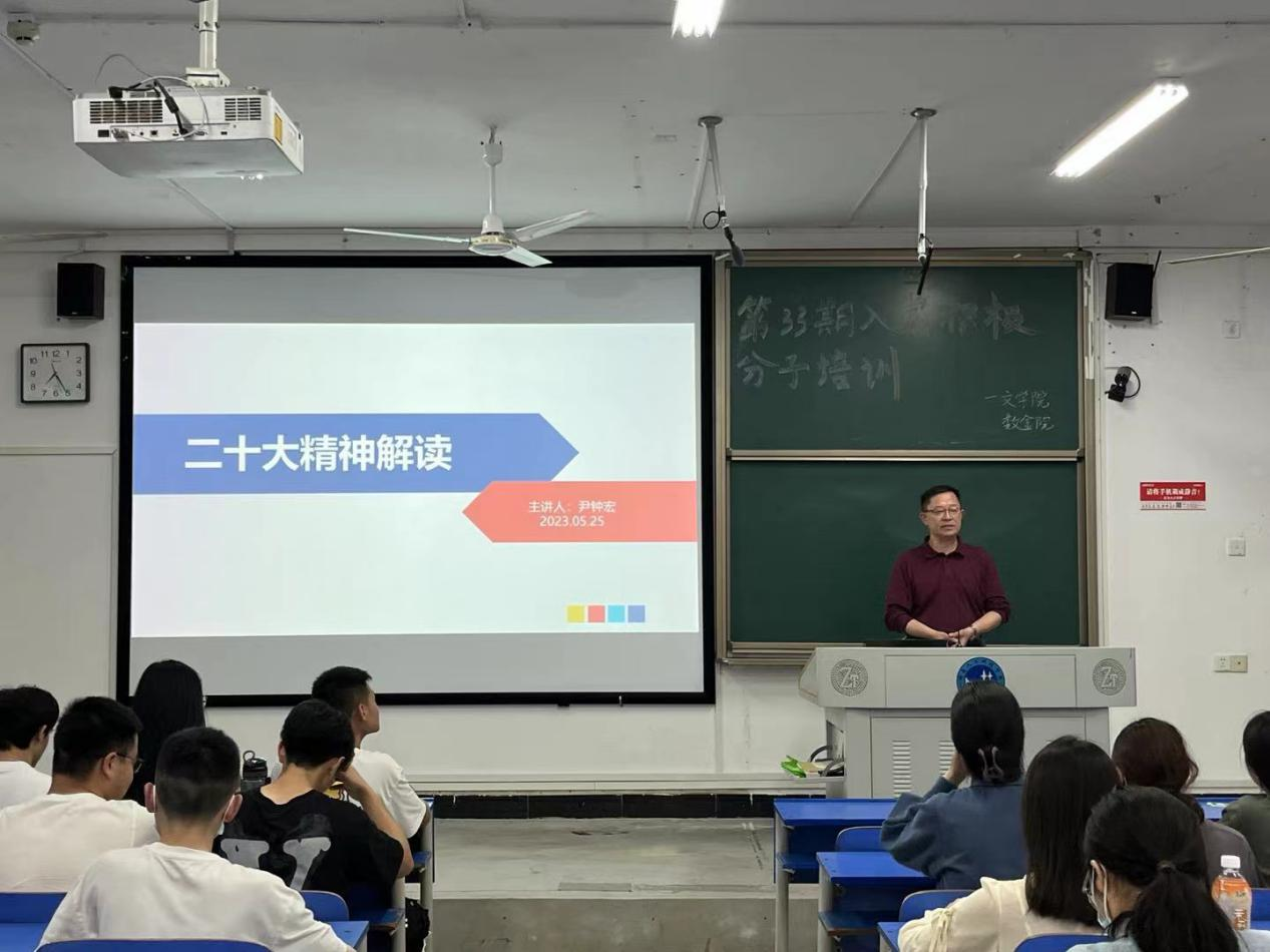 为深入学习贯彻党的二十大精神,切实增强入党积极分子学习贯彻的自觉性和坚定性,提高其政治素养和思想理论水平,5月25日晚上,文学院与数金院在致远楼211组织开展第33期入党积极分子培训第5课《学习贯彻党的二十大》。课程主讲人:文学院党总支书记尹钟宏。