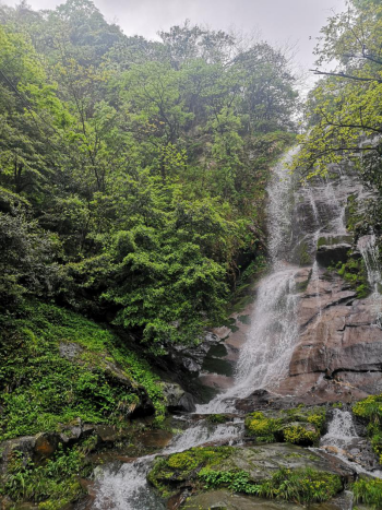 23日早上8点,同学们用完早餐之后,向樊家洞瀑布出发。樊家洞两岸悬岩峭壁,古木蔽天,沟壑如洞,银链般的瀑布似从九霄吐出,垂挂天地之间。从上泻下的水在池里激起湾湾涟漪,其气势之雄浑非吾语之能及。近而观之,水花飞溅,丝丝凉意沁透心脾。