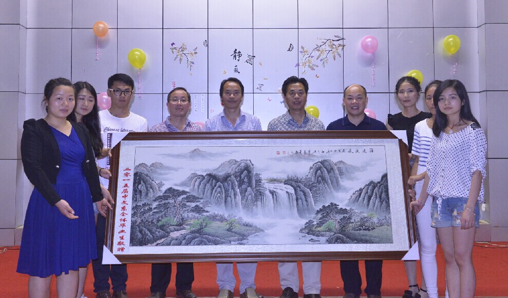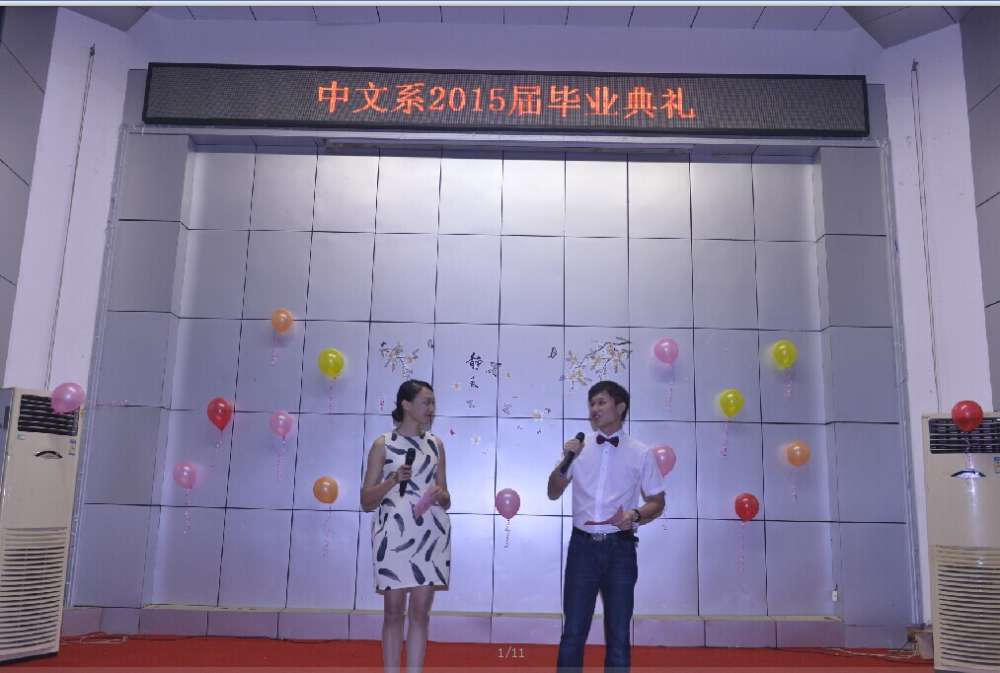 伴随庄严的国歌声后,系党总支书记黄立平教授为典礼致辞,他充分肯定了本届毕业生在校期间的表现,嘱托同学们在今后的人生道路上要怀抱梦想,勇于担当。随后,毕业生代表周旭发言,她深情回忆了在学校生活的点点滴滴,感恩母校老师的教诲。党总支副书记刘道锋博士则在毕业典礼上简单介绍了严峻的大学生就业形势下中文系毕业生取得的一系列可喜的成绩,他希望大家在接下来的人生道路上要艰苦奋斗,回报社会。毕业生大学三四年生活的点点滴滴组成了《季忆留夏》这个短片,从来不需要想起,永远不会忘记,四年的所有回忆都停留在了这个夏天,整个短片在悲喜交加的情绪中将典礼推向了高潮。由中文系全体教师的毕业赠言汇编而成的《致2015届毕业孩子们》的短片,寄托了老师们对2015届毕业生们的嘱托和深情,瞬间把典礼推向了又一个高潮。表彰环节系副主任王向阳教授宣读了2015届省级、校级优秀毕业生、优秀实习生、优秀毕业论文获奖者、研究生录取名单,王主任表达了对以上同学的祝贺,嘱托他们再接再厉,并与他们合影留念。此后毕业生代表向母系赠礼的环节再次把师生们的心紧紧靠在一起。