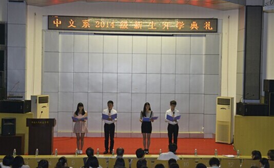开学典礼在庄严的国歌声中拉开了帷幕。中文系主任李夫泽教授在致辞中向2014级新同学表示了热烈的欢迎。李主任要求广大新同学借助中文系在教育上的资源优势,通过不懈的努力,持之以恒、提高自身素质。李主任同时希望新同学们更快乐的学习和生活、取得更好的成绩;接下来播放的中文系宣传片不仅有助于新生了解系部,更有助于激发新生的集体归属感,让他们更加期待接下来的大学新生活;老生代表马嘉睿代表中文系的全体老生,为新同学送上了热烈的欢迎,从实际出发从各方面为新生讲述自己的经验以及送上大学的美好祝福;2014级新生代表周颖青表达了对大学新生活的向往,并表示将努力奋斗,继续中文系的辉煌;由新老生组合倾情奉献的诗歌朗诵《因你我而精彩》更是激起会场阵阵热烈的掌声;之后中文系教师代表彭龙健老师用自信又诙谐的语言将中文系的优势一一列举给新生,同时还分享了自己的经验、并祝愿2014级新同学在大学里生活愉快、学业有成;最后由纪忠璇老师领誓,所有新生起立,右手握拳庄重宣誓:以己所学奉献于祖国和全人类的文明进步。