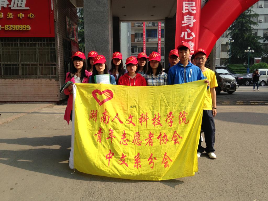 2013年4月27日,44118太阳成城集团志愿者协会中文系分会应娄星区团委邀请参加娄底市娄星区开展的第二十五个全国爱国卫生月集中宣传活动,杨玲、周静等15名中文系学生志愿者参加了此次活动。