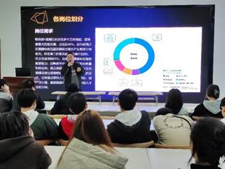 会上,企业负责人会上对前来参会的学生表示热烈欢迎。首先,企业负责人向同学们介绍了公司的发展概况、企业文化、业务领域、工作岗位划分等,随后,企业负责人围绕各岗位的市场需求展开专业介绍,促使学生进一步了解企业、了解市场前沿,了解所学专业在实际工作中的应用。