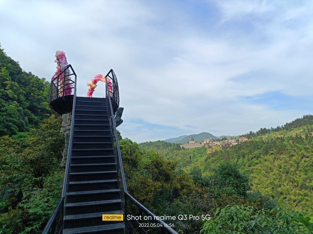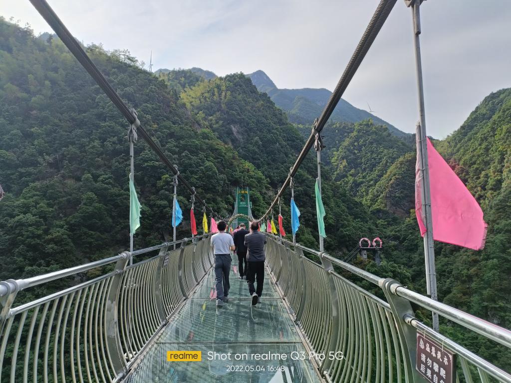 午餐过后,同学们跟随导游游览龙脊峰景区。穿过“时光隧道”、越过“天梯”,但见怪石峥嵘,古木参天。置身其中,步步是景,处处是情。祭天台上红带飘扬,古战场遗址展现了原始时代惨烈的战争。山上景观,将梅山先民的日常生活展现得淋漓尽致。最让人叹为观止的是龙脊峰天险处,山势险要,悬崖两侧像刀削一样陡峭。山顶崖谷间,一座镂空铁索桥凌空飞架,桥下是百丈悬崖。同学们纷纷上桥。胆大的同学乱云飞渡仍从容;胆小的同学闭着眼,在同学的搀扶下战战兢兢过桥。龙脊峰返回的路走得特别轻快。大多数同学选择从剥离滑道滑到山脚。两千多米的滑道,让大家充分体会到了速度与激情。