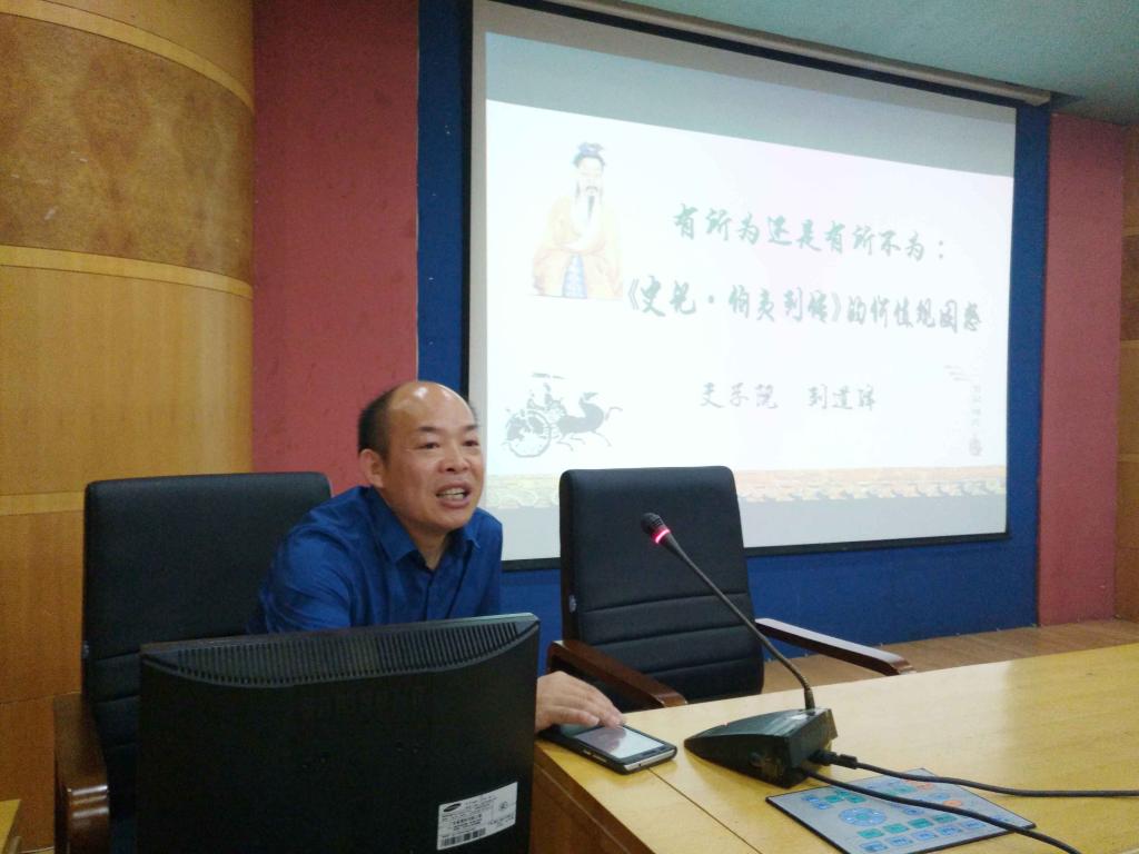 201768日晚,在养根楼报告厅举行了由文学院党总支副书记刘道锋博士主讲的“有所为还是有所不为:《史记.伯夷列传》的价值困惑”的题讲座。本场讲座由大学语文基础教研室承办,文学院院长黄立平教授亲自主持。参与此次讲座的老师有文学院李夫泽教授、文学院倪正芳副院长、文学院张峰副教授、文学院姜珍婷博士、文学院罗主宾博士、文学院段湘怀老师。此外还有文学院的学生代表200