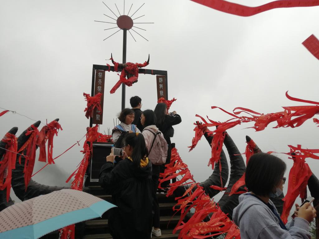 登上天梯后,师生们来到了祭天台。祭天台中有龙冠,前有9个梯步,边有8个大牛角,4对小牛角。牛角上挂满了红飘带,随风飞扬,仿佛重现了原始时代祭天仪式的盛况。之后就来到了古战场遗址,透过这些古遗址,不禁让人感叹原始人生活的艰辛和曾经战斗的惨烈。