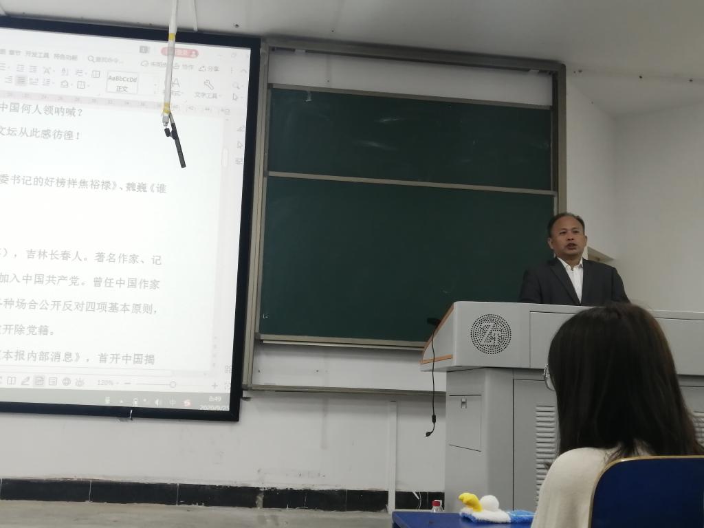 2020年9月25日上午,致远楼201教室内,文学院邀请娄底市民间艺术家协会主席、中国作家协会会员、44118太阳成城集团客座教授袁杰伟先生,为秘书学专业18、19级学生作了一场名为“报告文学的机遇和挑战”的文学讲座。文学院秘书专业负责人张峰老师主持讲座,马藜教授等在座。