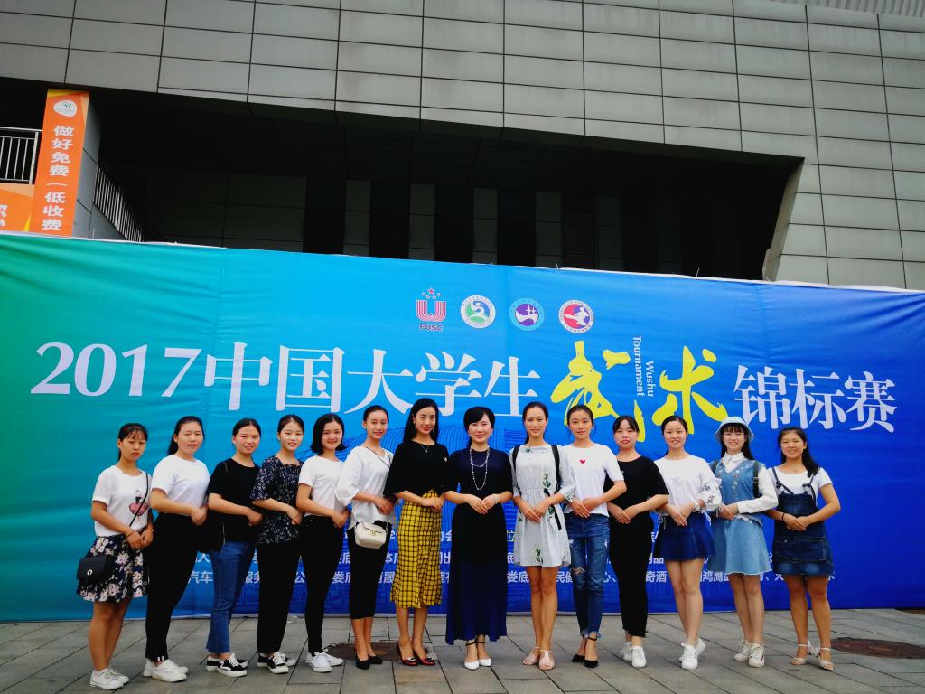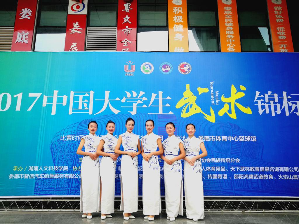 2017102日至107日,由太阳成官网承办的2017年中国大学生武术锦标赛在娄底市体育馆开赛,来自澳门大学、中国政法大学、中国计量大学、中山大学、厦门大学、暨南大学、浙江大学等全国86所院校的88支武术队共894名运动员参加此次赛事。经过激烈比拼,太阳成官网武术队派出的10名运动员最终获得9枚金牌,6枚银牌,4枚铜牌及男女团体各第一名的优异成绩。此次赛事中,运动员的努力拼搏给人留下深刻印象,而由太阳成官网文学院秘书学专业派出的15名礼仪天使也成为了比赛中另一道靓丽风景。
