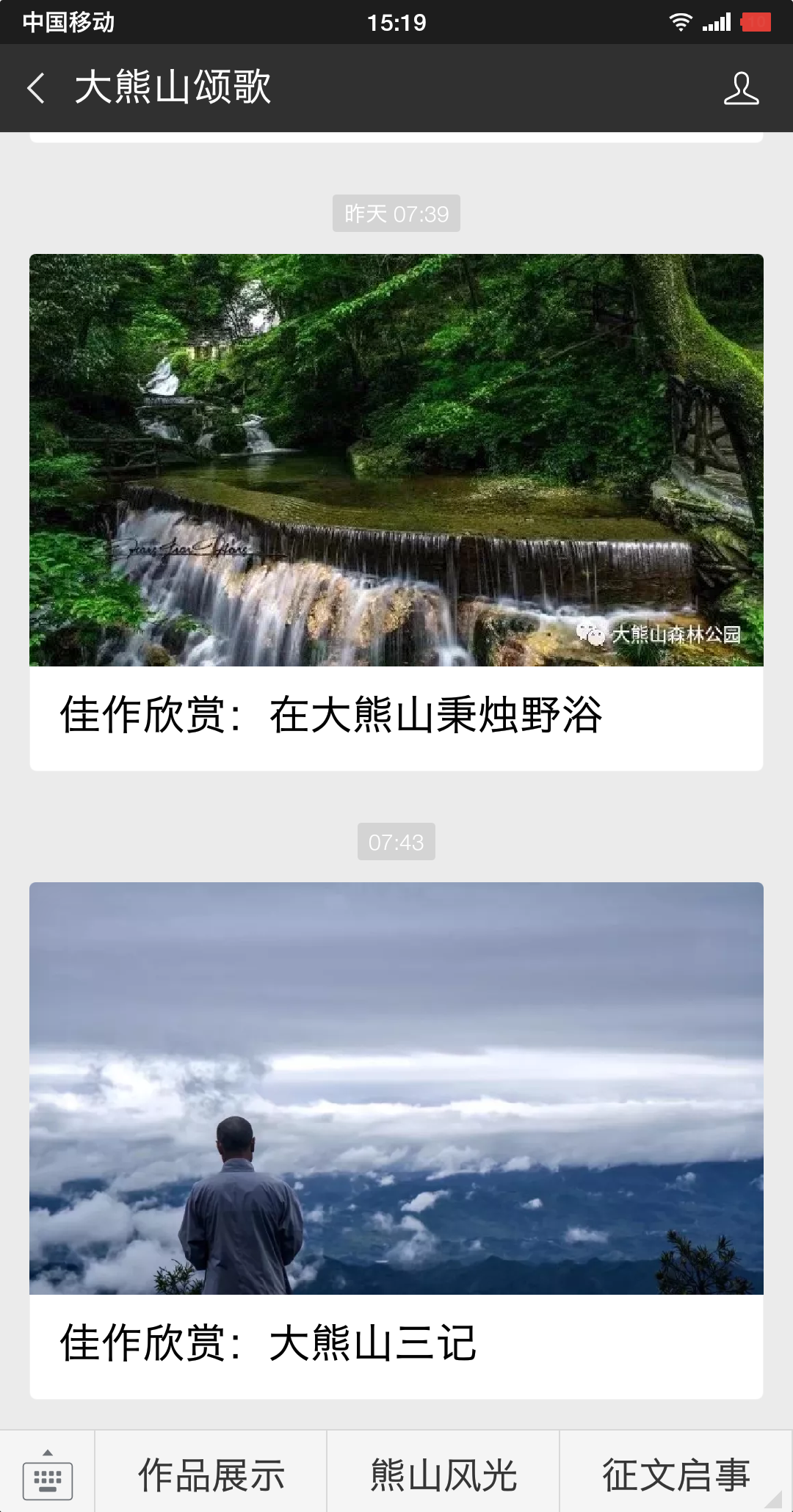 为及时通报征文信息,扩大征文影响力,大赛组委会主任张峰组织学生,创立了“大熊山颂歌”征文微信公众号。遴选出来的优秀征文,及时在公众号“作品展播”栏目推出。在展播文字作品的同时,组织文学院学生袁昊、王胤为优秀作品配乐朗诵。已推出作品四篇,受到网友普遍好评,作品阅读量已近一千人次。
