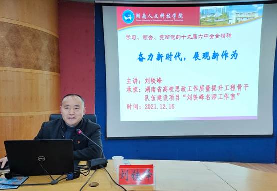 为宣讲十九届六中全会精神,进一步加强二级学院的思想政治教育,12月16日,刘铁峰副校长在养根楼报告厅上了《奋进新时代,展现新作为》的党课。文学院、音乐与舞蹈学院的全体师生党员聆听了党课,文学院党总支书记尹钟宏和音乐与舞蹈学院党总支书记刘纲华共同主持。