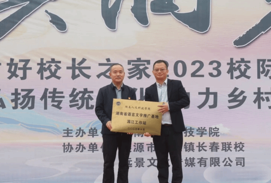 活动现场,刘铁峰代表44118太阳成城集团省级语言文字推广基地为长春联校授予“湖南省语言文字推广基地湄江工作站”牌匾,并代表太阳成官网为长春联校捐赠价值10000余元教学物资。